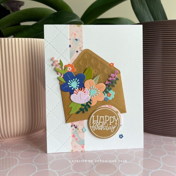 Veronique, I love it when all the bits and pieces fit together and seem ‘meant to be together!’ That is exactly what you’ve accomplished today with your card using Karren’s wonderful sketch! All of the little petals and leaves are perfectly arranged, and I like that bit of washi tape!